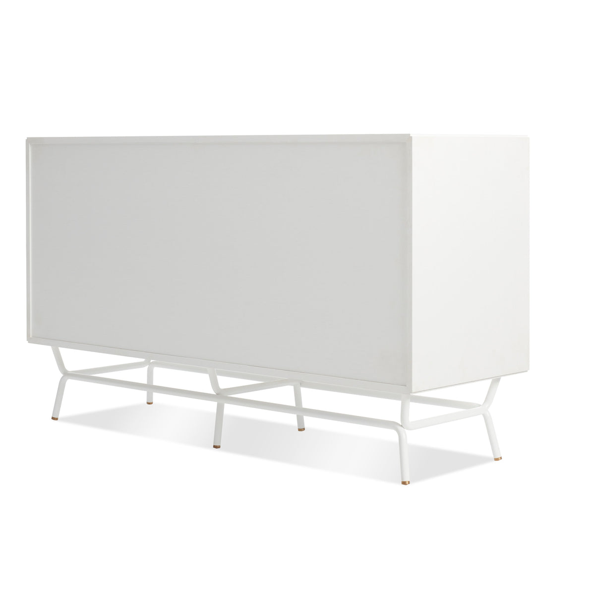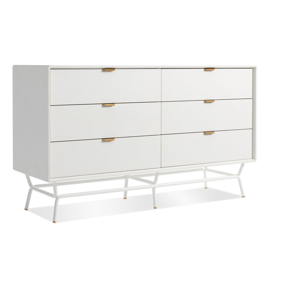 Give simple a lift. A powder-coated steel base props up a refined, unassuming silhouette. Antique brass pulls keep it pretty. Soft-close drawers keep it quiet.