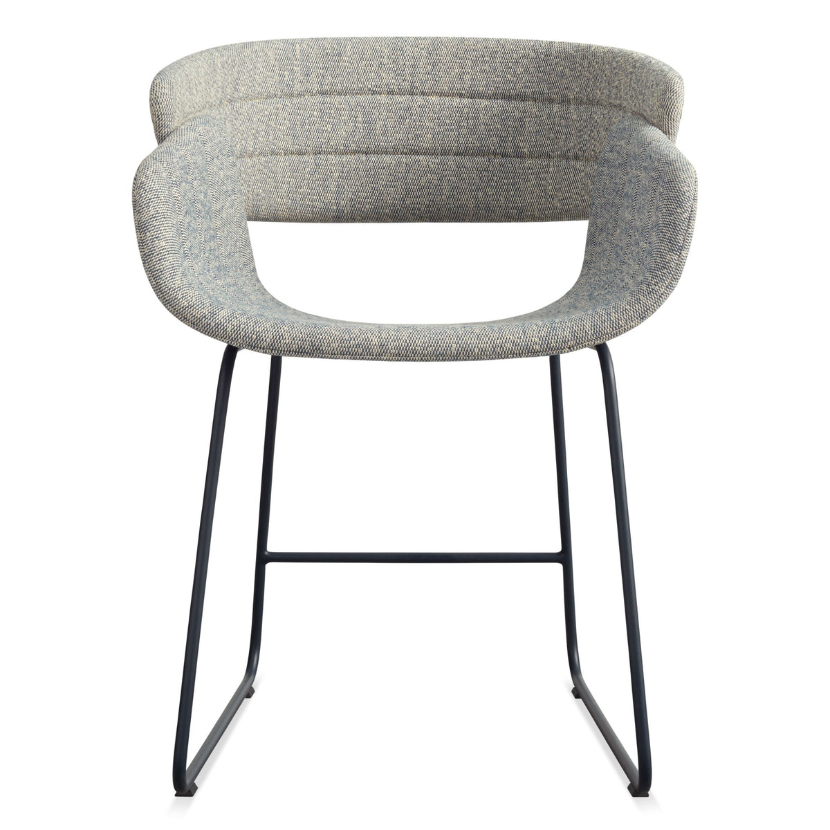 An upholstered seat and back work the curves and overlap just so to create a chair that invites you to sit down and stay awhile. The channel stitch detail may not improve the aerodynamics, but it sure does looks swell. With a colour coordinated powder coated steel sled base.