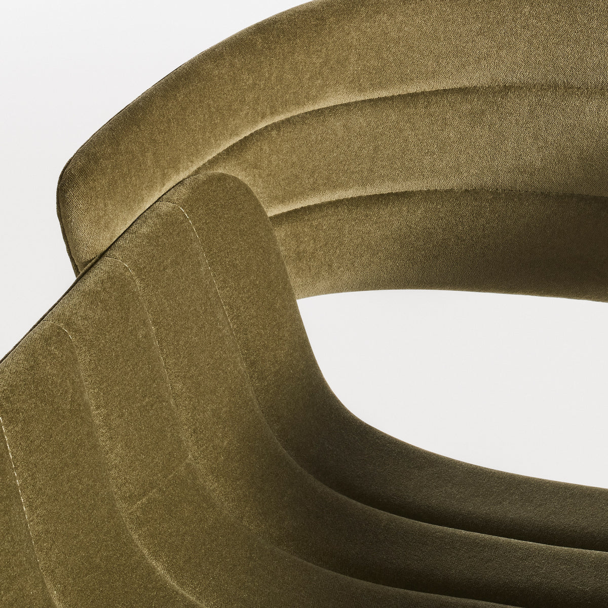 An upholstered seat and back work the curves and overlap just so to create a chair that invites you to sit down and stay awhile. The channel stitch detail may not improve the aerodynamics, but it sure does looks swell.