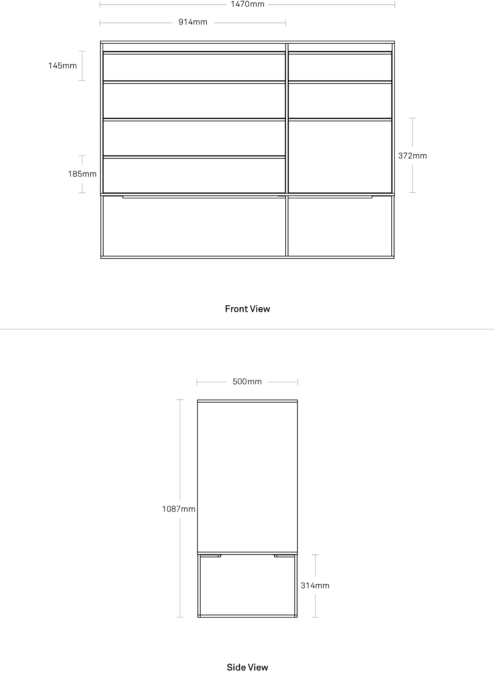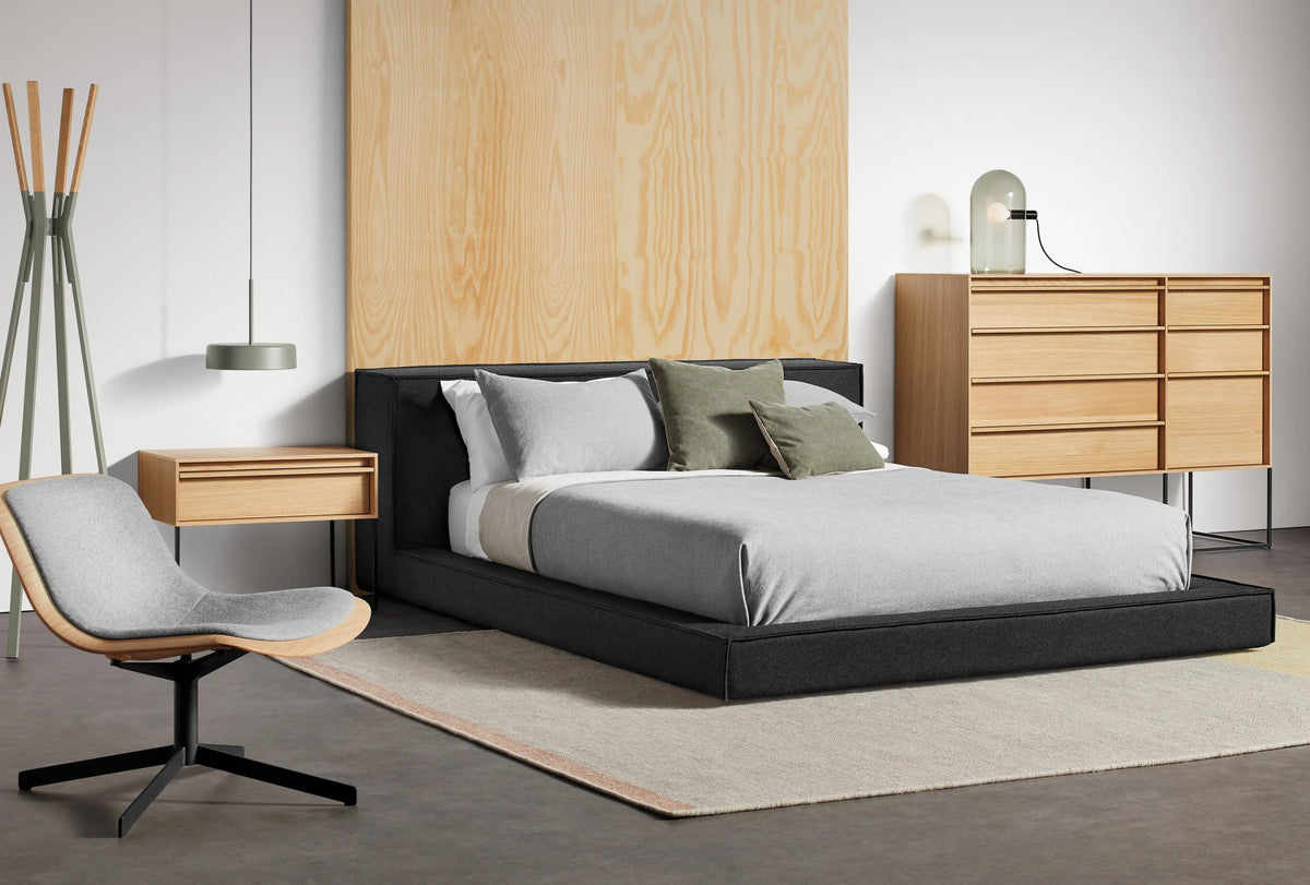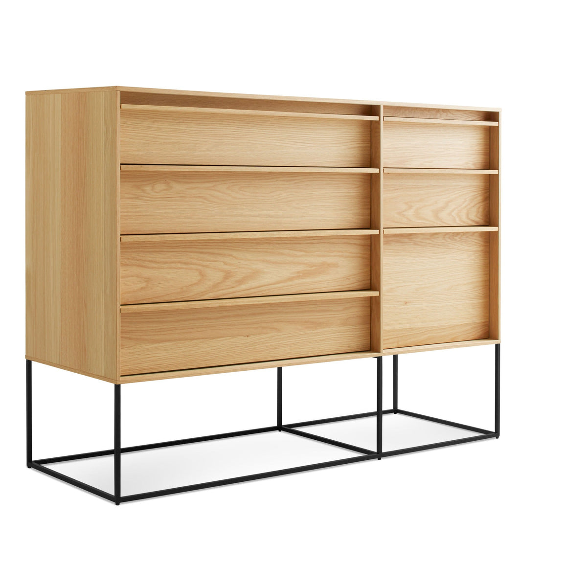 The Rule Collection serves up well considered planes and angles that are ready to slay clutter in any room. Deep set drawer fronts, detailed by a wood pull, reinforce the linear design and create a seductive shadow line. Dusk-colored drawer and door interiors provide a surprise dose of color while a square steel base ties it all together to form an elegantly, uncomplicated form.