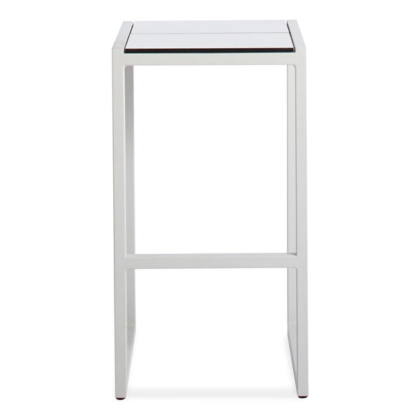 Modern outdoor barstool designed with crisp minimal white powder-coated aluminum and solid laminate top. Clean lines designed to weather the elements.