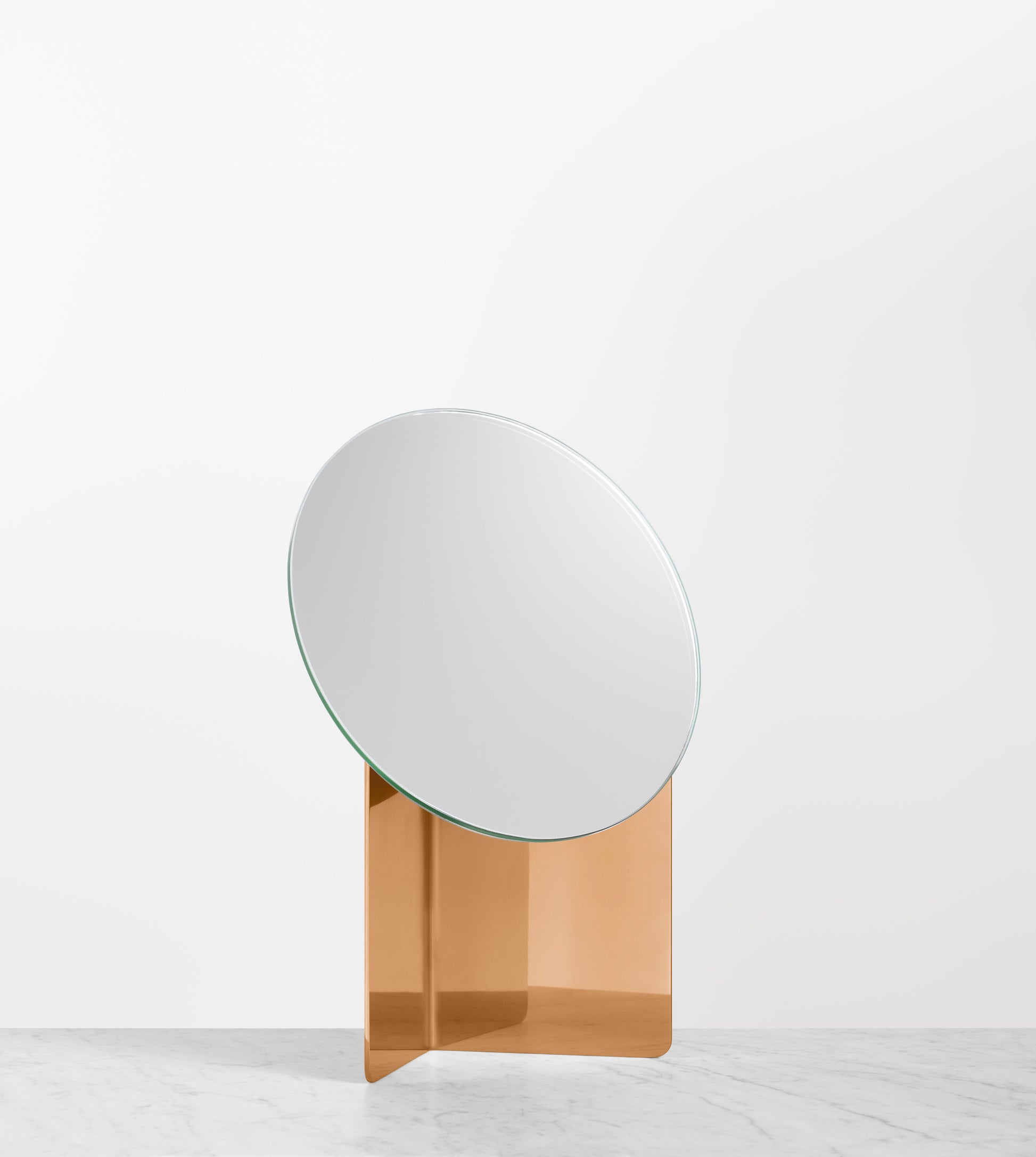 Take a good long look. A simple round mirror sits atop an angled steel base that flaunts flashy finishes and guarantees you’ll always like what you see.