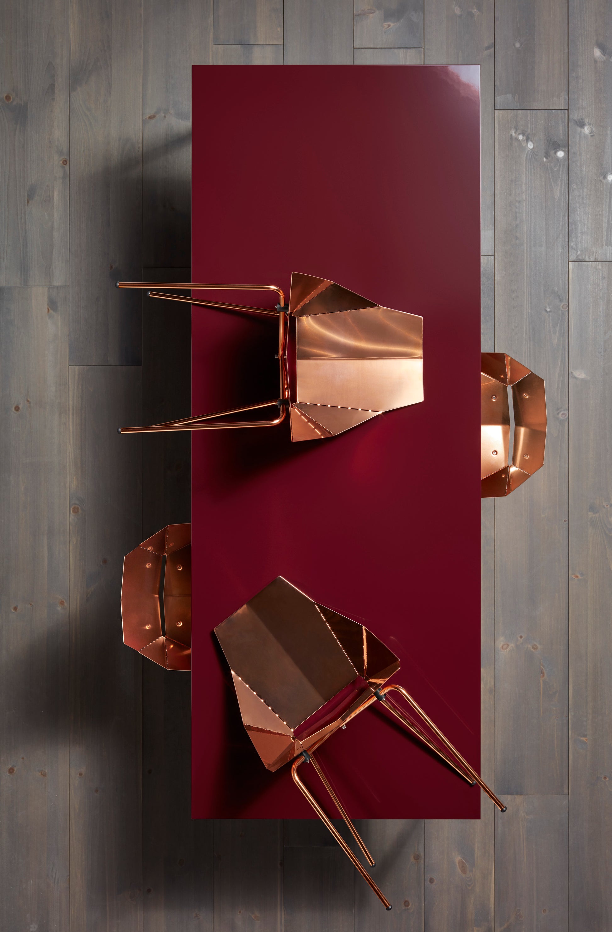 Sashay! Shantay! Strut works its architectural angles to the max. Ample work space, dining space or dance space. Powder-coated steel frame with polyurethane wood substrate top